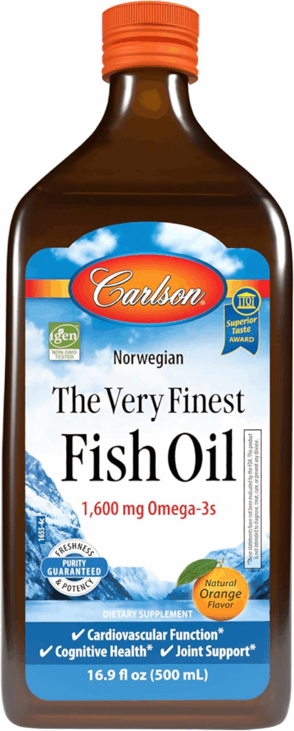 Personnellement, je prends une forme liquide d’oméga-3 (Carlson), l’une des marques connues qu’on trouve au rayon des huiles de poisson au frigo (version citronnée):